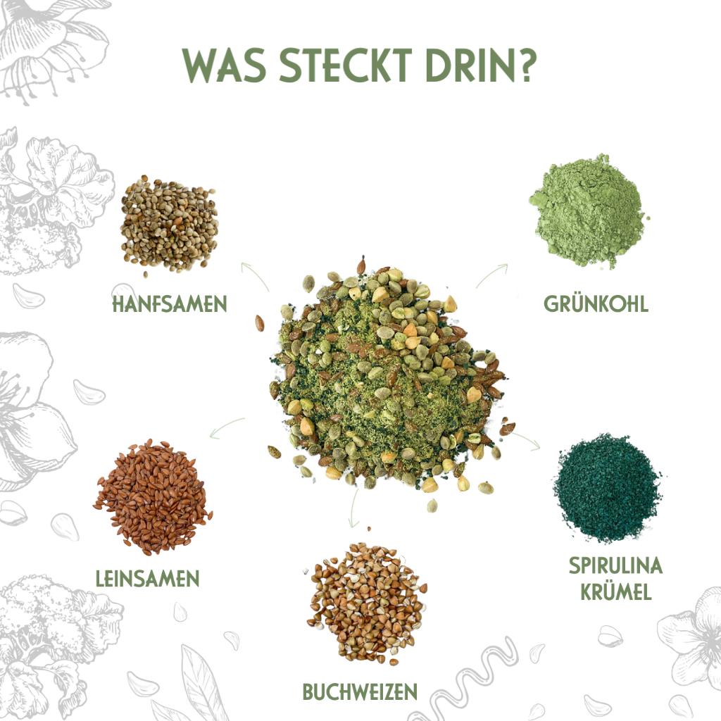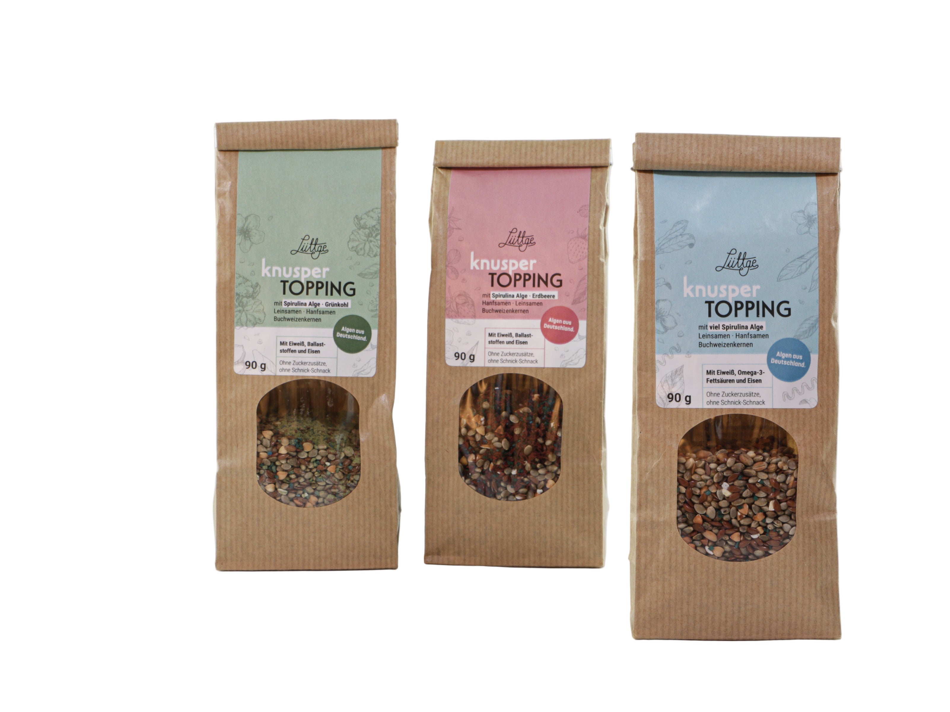 Unsere neuen Knusper Toppings sind der Kracher im Müsli oder Porridge. Die Toppings mit viel Spirulina Alge und weiteren Zutaten wie Leinsamen, Hanfsamen, Buchweizenkerne und Beeren sind eine natürliche Quelle für Ballaststoffe, Spurenelemente und Omega-3-Fettsäuren.