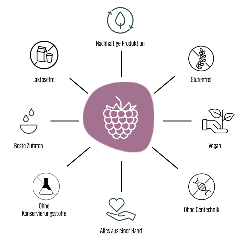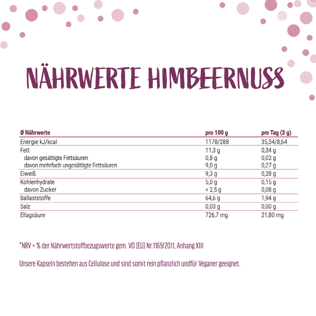 They contain the valuable ingredient ellagic acid. Ellagic acid belongs to the group of phenolic acids ; these are only found in nuts and fruits. In addition to the valuable ellagic acid, Lüttge Raspberry Nuts score points with their high content of fiber and polyunsaturated fatty acids.