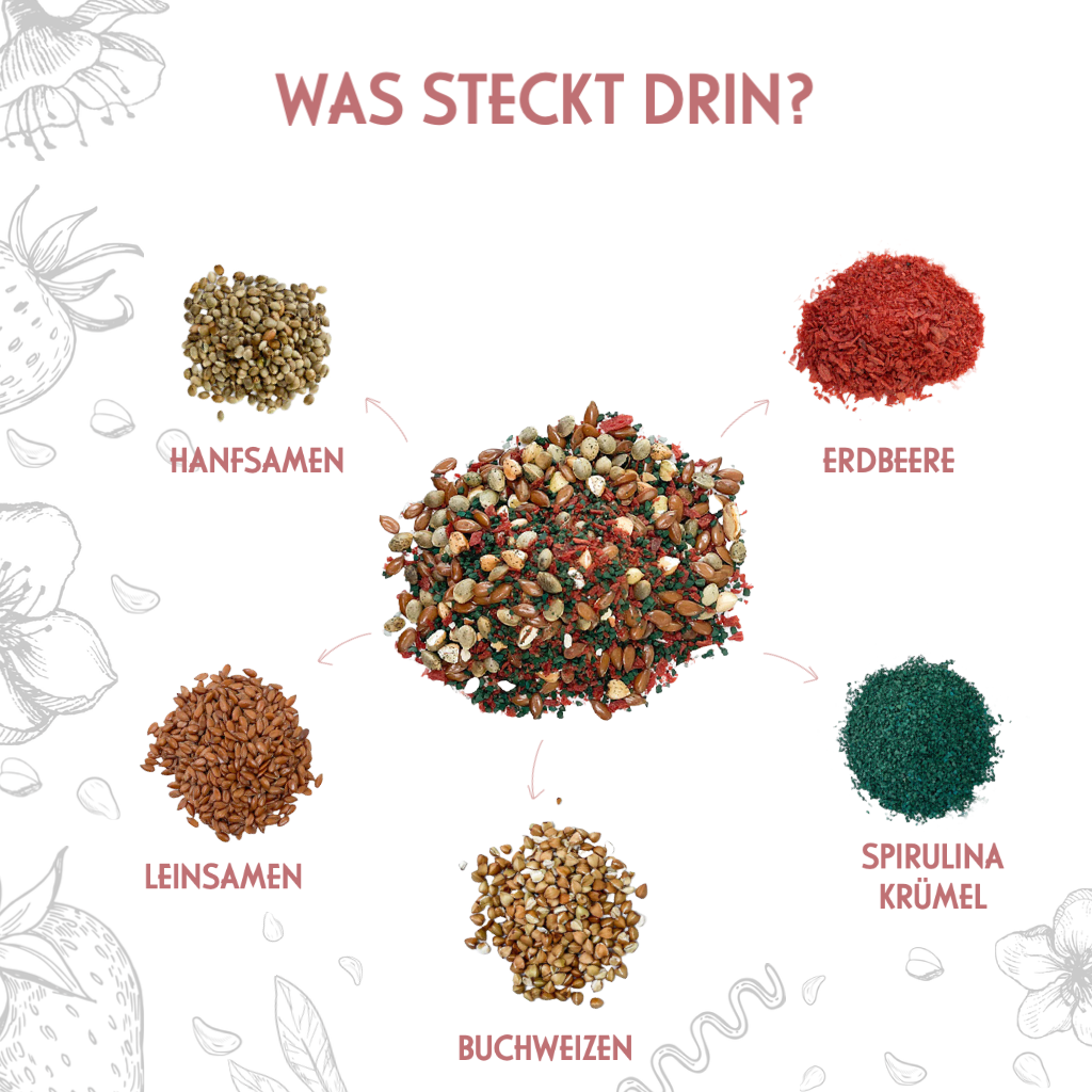 Roasted hemp seeds (33%), linseed (33%), roasted buckwheat kernels (17%), spirulina (algae 12%), strawberry granules (10%).