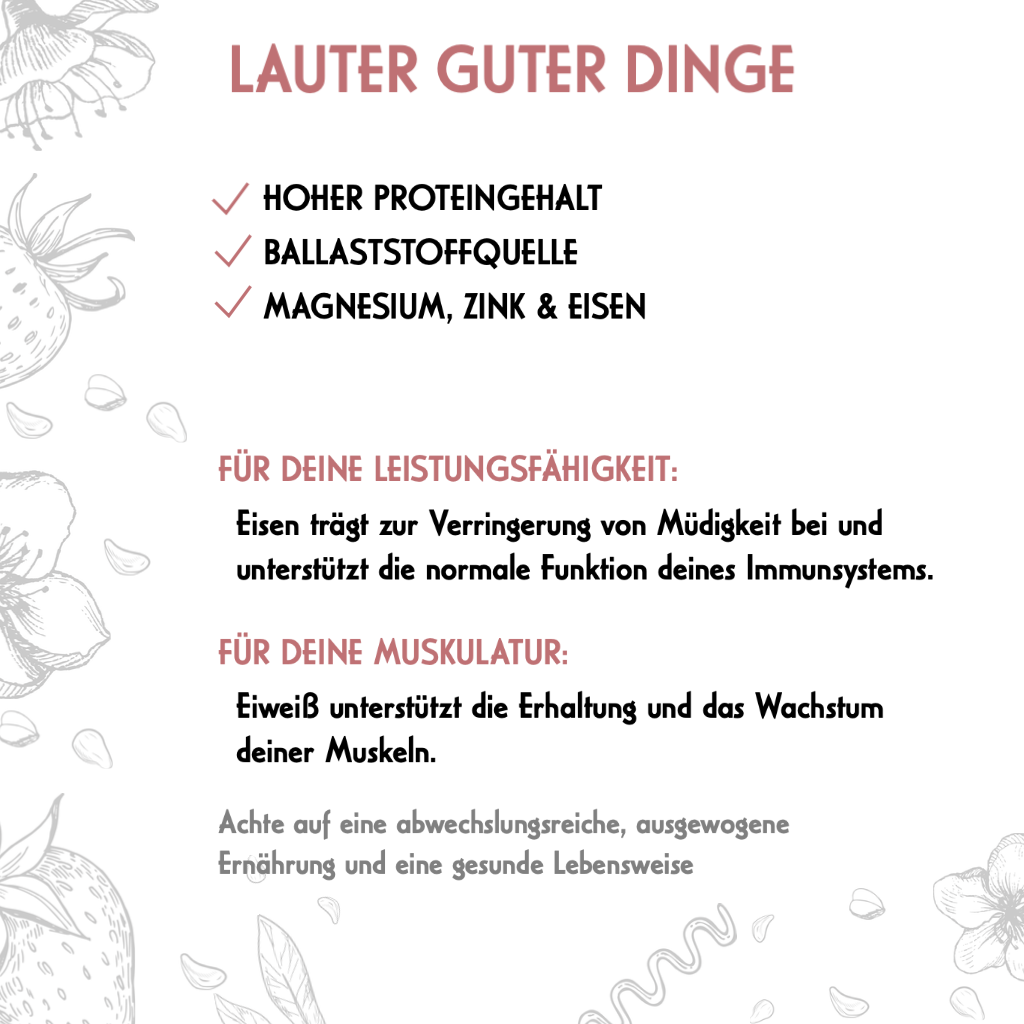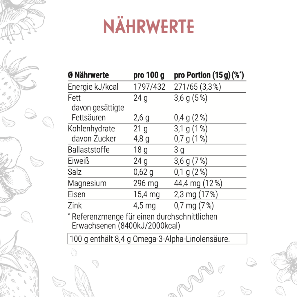 The small power packages of linseed, crispy roasted buckwheat kernels and aromatic hemp seeds, in combination with spirulina algae, provide you with fibre and proteins, plant-based omega-3 fatty acids as well as iron, magnesium, zinc and vitamin K.